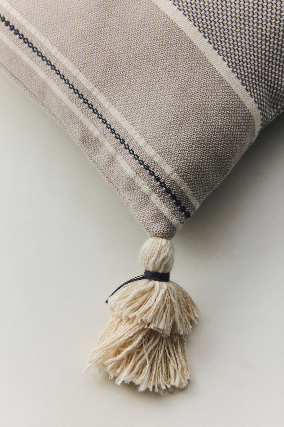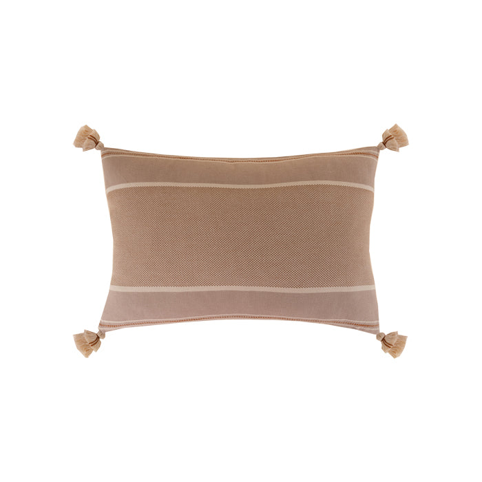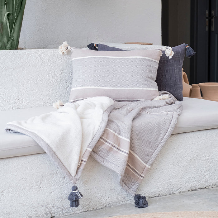 Yüzeyindeki doğal doku, bulunduğu mekâna sakin ve ölçülü bir hareket kazandırır. Köşelerinde yer alan el yapımı ponponlar, tasarımı sessizce tamamlayan ince bir detaydır. Abartısız ama karakterli bir duruş sunar. Arka yüzünde yer alan gizli fermuar, formu bozmadan bütünlüğü korur. Koltuk, berjer ya da yatak üzerinde yalın bir tamamlayıcı olarak konumlanır. Kırlent içsiz gönderilmektedir.