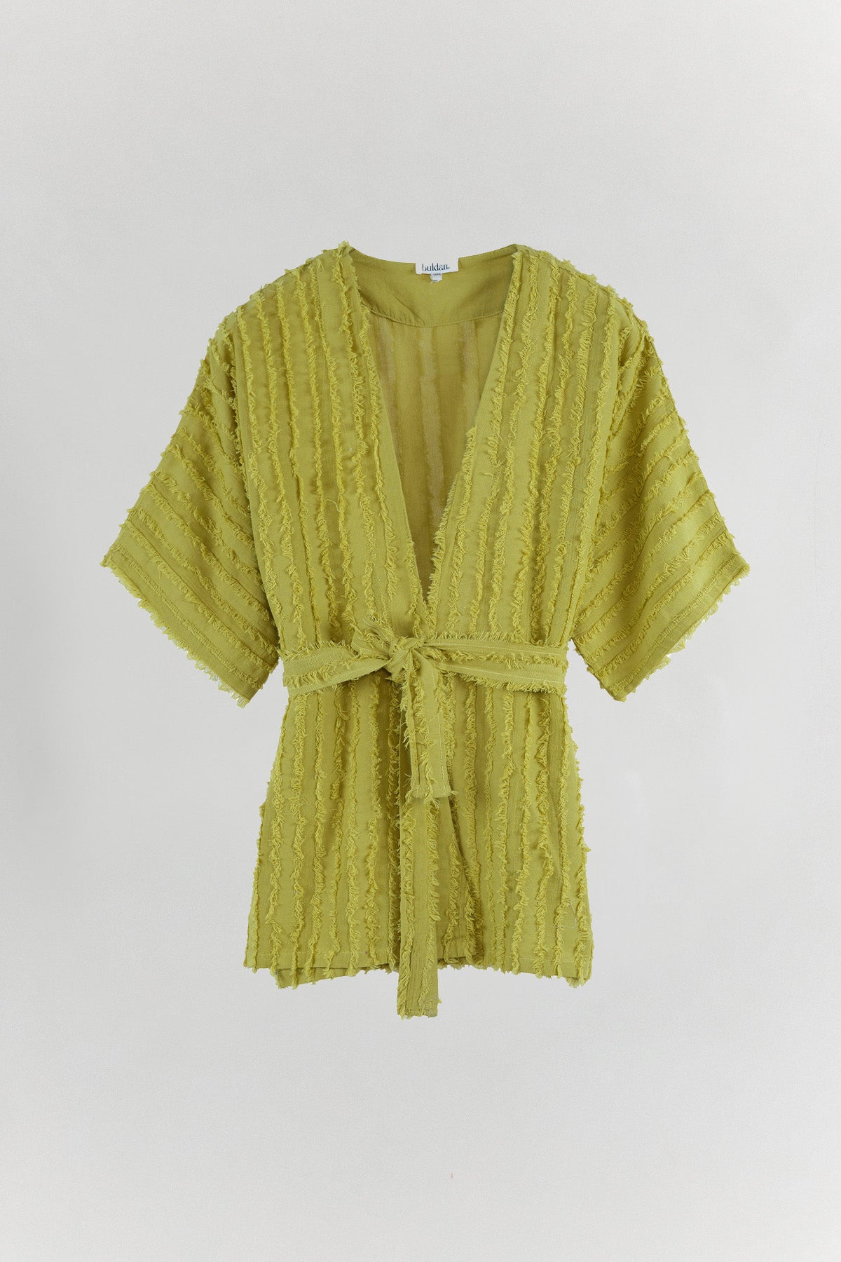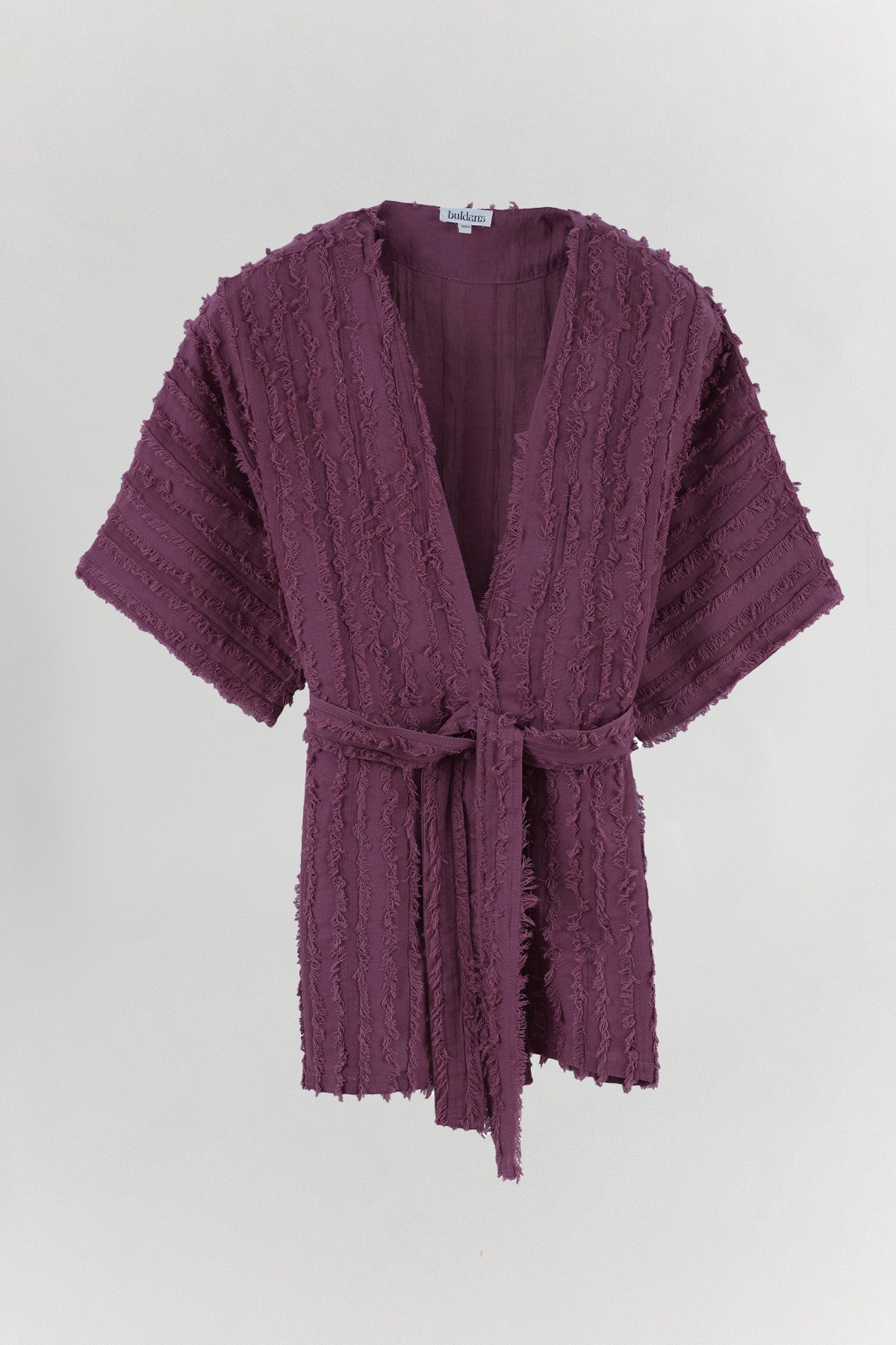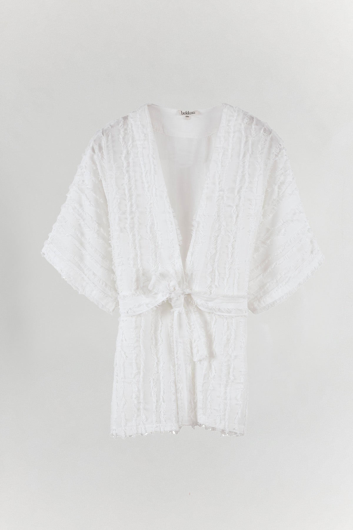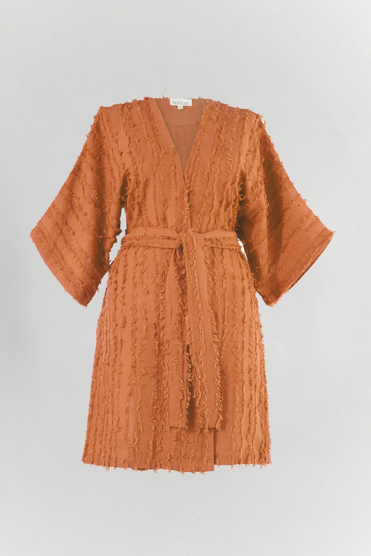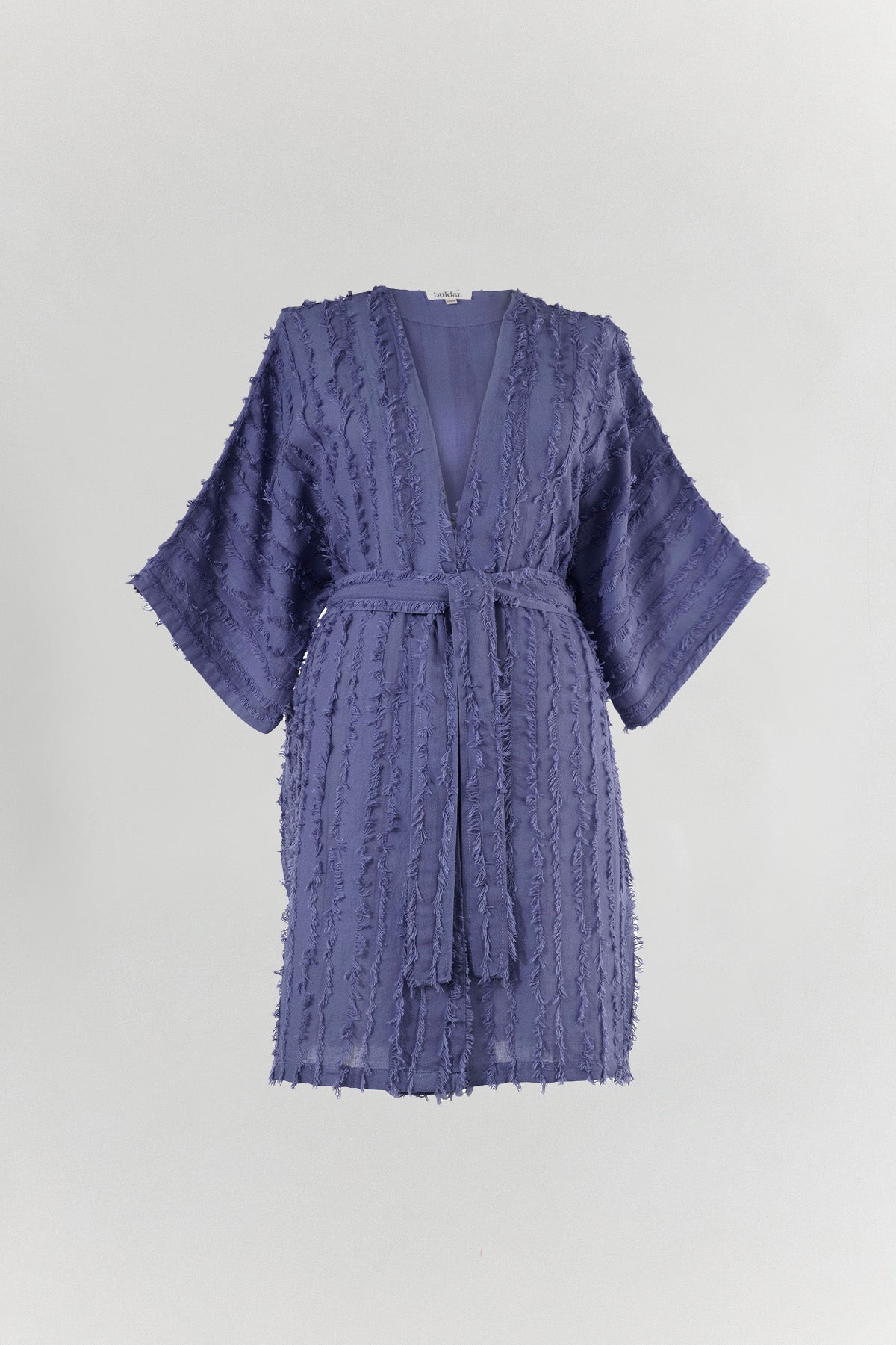 Eva Kimono, özel dokuma tekniğiyle üretilen püsküllü kumaş yapısıyla yüzeyde üç boyutlu bir hareket oluşturur. Dokusal yapısı, tasarıma bohem ve özgün bir karakter kazandırır. Kemerli formu sayesinde açık ya da bağlanarak kullanılabilir. Belden bağlandığında silueti belirler; açık kullanımda daha akışkan ve rahat bir duruş sunar. %100 pamuk yapısı hafif ve nefes alan bir kullanım sağlar. Ev giyiminde, günlük kombinlerde ya da plajda mayo ve bikini üzerine rahatlıkla tercih edilebilir. Eva, dokusuyla hissedilen, sade ama güçlü bir parçadır.