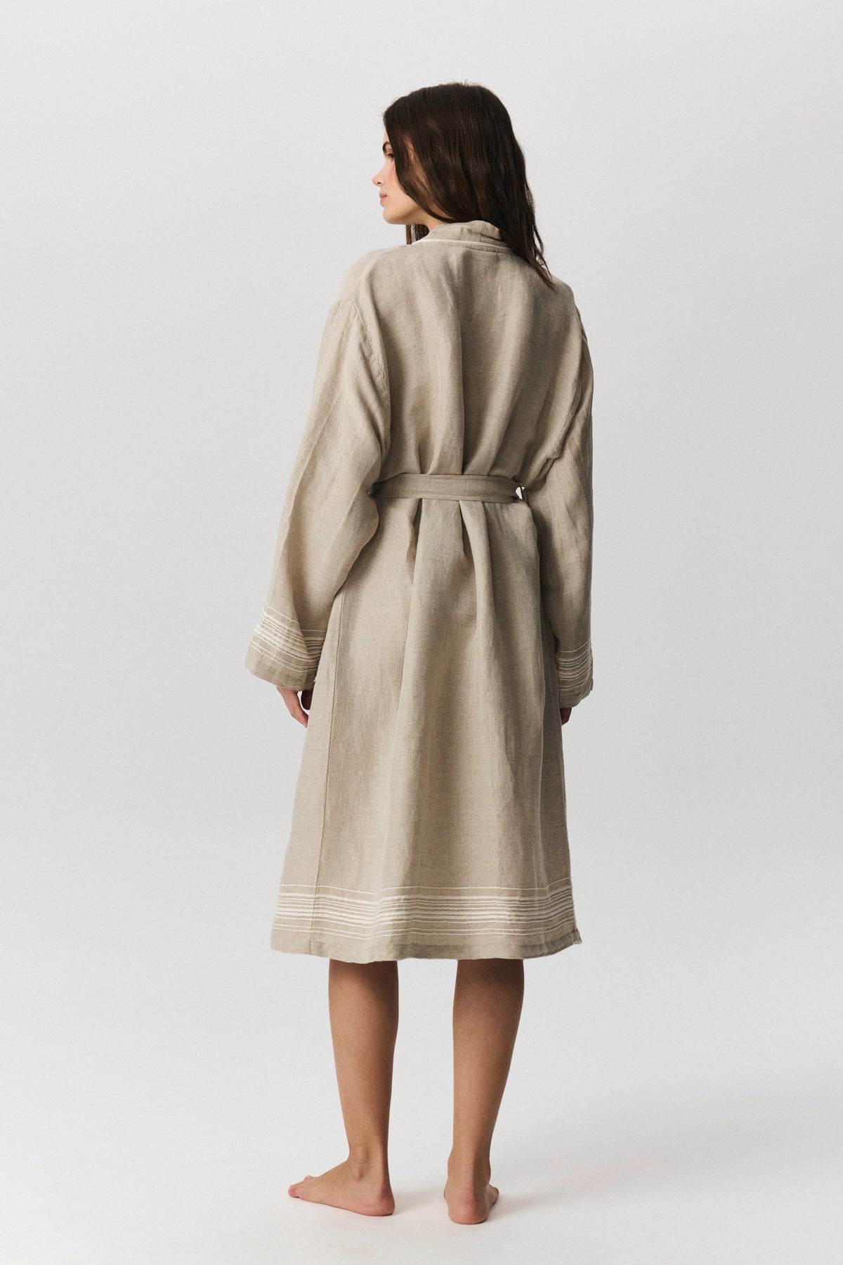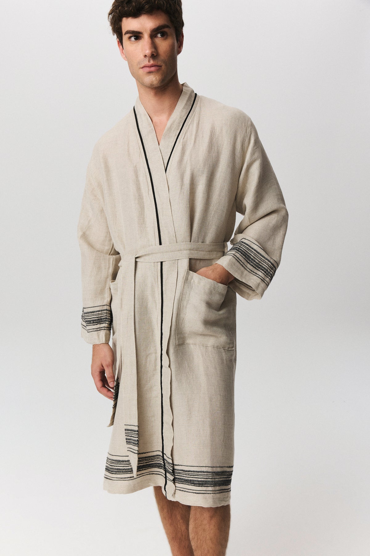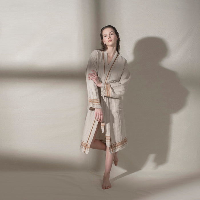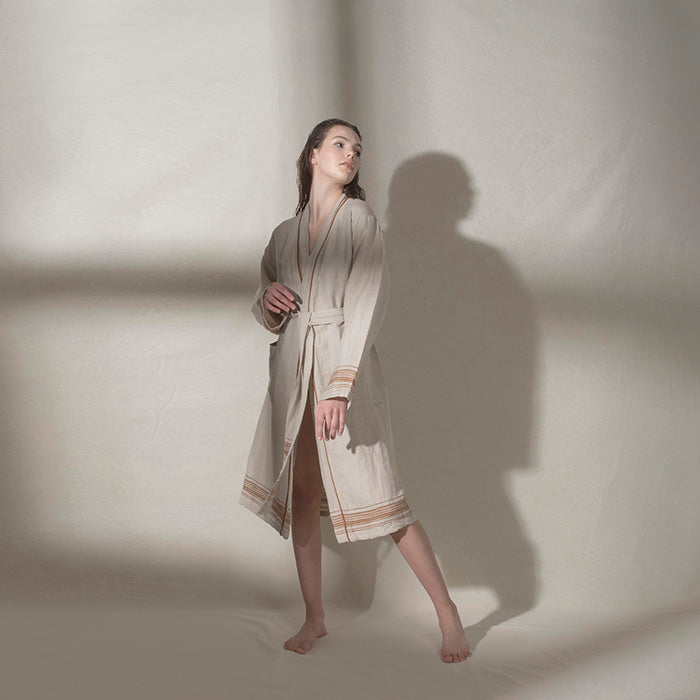 Marl serisi, keten ve pamuk karışımlı doğal dokusuyla banyodan plaja uzanan çok yönlü bir kullanım sunar. Buldans’a özel tasarlanan bordür detayları, elde dokunmuş hissi veren karakteristik bir görünüm oluşturur. Ön yıkamalı keten dokusu sayesinde kumaş yumuşak bir tutum kazanır ve kullanım sırasında doğal bir konfor sağlar. Nefes alan yapısı ve hafifliği sayesinde hızlı kurur ve günlük kullanımda pratiklik sunar. Seri; bornoz, peştemal ve peşkir seçenekleriyle bir bütün olarak tasarlanmıştır. Zamansız çizgileri ve doğal dokusuyla sade ama güçlü bir banyo–spa koleksiyonudur.